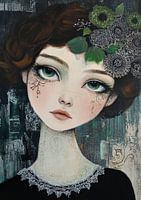 Groene Ogen met Bladerkroon - Dit vrouwenportret schilderij toont een jonge vrouw met grote, expressieve groene ogen en een zacht gezicht, versierd met een complexe kroon van groene bladeren en elegante witte kanten details.