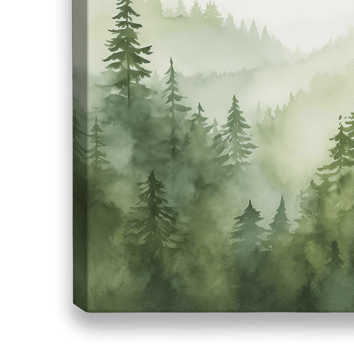 Dit aquarel schilderij presenteert een uitgestrekt berglandschap doordrenkt van de weelderige pracht van eindeloze lariksbomen.