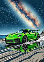 Onder een smaragdgroene hemel vol verre sterren schittert de groene GT3 RS door regen en mist. Het licht van de Melkweg breekt op elke druppel en hult de auto in een kosmische glans. Hij voelt levendig tegen de leegte, uitdagend onder de sterren, een schepsel geboren uit regen en ruimte.
