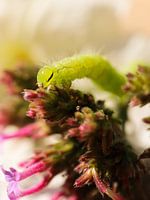 Macro geschoten groene rups, macro gefotografeerd, op een roze bloem. Warme kleuren.