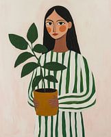 Een schilderij toont een vrouw in een elegant groen-wit gestreepte mantel die met zorg een potplant vasthoudt. De vrouw straalt een gevoel van kalmte en verbondenheid met de natuur uit, terwijl de heldere groene en witte strepen van haar kleding prachtig contrasteren met de levendige bladeren van de plant. Het geheel wordt omgeven door een zachte achtergrond, waardoor de aandacht volledig op haar en de plant wordt gevestigd. De combinatie van de kleuren en de houding van de vrouw creëert een serene en harmonieuze sfeer, die de schoonheid van zowel de persoon als de natuur benadrukt.
