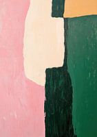 Een minimalistisch schilderij in roze, groene en gele tinten met penseelstreken en een abstract figuur in zwarte kleur in de rechterbenedenhoek. Het werk wordt gekenmerkt door dikke lijnen, een minimalistische esthetiek en een vintage stijl. Het schilderij heeft een roze achtergrond met een groene accentkleur en is in de stijl van Matisse. Dit meesterwerk is een olieverf op doek met dikke, zichtbare penseelstreken.