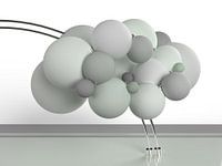 Driedimensionaal (3D) abstract ontwerp van zwevende ballen in de pastel kleuren groen, grijs en wit, gedragen door 2 chroom stangen. Vormt een tweeluik met Groene ballen links.