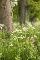 Foto van een fleurige berm met wit bloeiend fluitenkruid en andere wilde bloemen. De groen en wittinten geven een fris en lente achtig beeld. Mooi in een natuurlijk interieur.