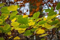 Bladeren hangend aan een boom in het bos. Het is herfst, de bladeren zijn verkleurd naar oranje en bruin. Het bos heeft een rustige sfeer.