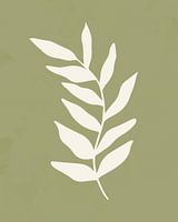 Minimalistische illustratie van een stijlvolle stengel met bladeren in een natuurwitte kleur op een groene, licht getextureerde achtergrond.