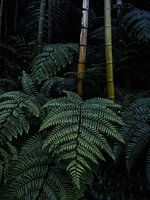 De foto is gemaakt in een bamboebos in Sichuan, China. Het beeld laat een rustige en natuurlijke omgeving zien, waar het licht maar beperkt door de bladeren heen valt. Op de voorgrond zijn grote groene bladeren zichtbaar. Ze hebben een duidelijke nervenstructuur en vormen een natuurlijk patroon dat bijdraagt aan het botanische karakter van de foto. Tussen de bladeren zijn een paar bamboestengels te zien. De stengels zijn recht, smal en herkenbaar aan hun gladde oppervlak en de knopen die de segmenten van de bamboe verdelen.