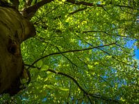 een perspectief van een boom genomen van naast de boomstam richting het groene bladerdek van de boom.