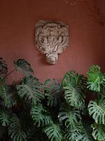 De groene bladen van de Mostera plant tegen de donker pastel roze muur vormen een prachtige kleurencombinatie. Deze foto is gemaakt in de tuinen van Real Alcazar in Sevilla, Spanje. De combinatie van kleuren geeft een warm gevoel en botanische sfeer.