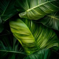 Een harmonieuze symfonie van weelderige groene tinten ontvouwt zich waar lichtgevende bladeren zich nestelen in gebogen vormen. De fijne nerven tekenen ingewikkelde patronen, terwijl het spel van licht en schaduw een mysterieuze diepte creëert. Een levendig natuurlijk arrangement dat frisheid en vitaliteit uitstraalt en de zintuigen verkwikt.
