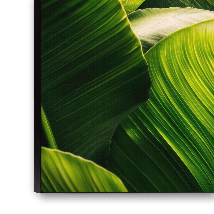 Er ontvouwt zich een fascinerend samenspel van levendige groentinten, terwijl grote, gebogen bladeren elkaar elegant overlappen. De stralende lichtreflecties benadrukken de fijne structuren en nerven van de bladeren, bijna als een artistiek schilderij van de natuur. De levendigheid van het tropische woud is hier voelbaar, een uitnodiging om te ontspannen in het groen.
