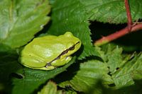 Ze zitten goed beschut tussen de bladeren van de bramen en zijn lastig om te spotten. Wat een kleine pareltjes! Dit is een kleine groene boomkikker in de Mortelen in Noord-Brabant.