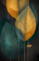 Een abstracte creatie van bladeren weergegeven in groene en oranje, natuurlijke kleuren.