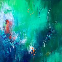 Een levendige mix van turkoois en groen domineert het doek, doorspekt met oranje en rode nuances. Gestructureerde patronen en strepen zorgen voor diepte en dynamiek.