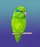 Een aquarel tekening van een groene forpus, ook wel muspapegaai genoemd. Het is een mannetje. Hij zit comfortabel op een stokje en rust op een pootje.