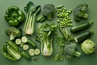 Dit aantrekkelijke arrangement bevat een verscheidenheid aan groene groenten, perfect gevangen in hun versheid en levendigheid. Van broccoli en courgettes tot erwten en spinazie, elke groente is zorgvuldig geplaatst om zijn unieke textuur en vorm te benadrukken. Ideaal voor keuken- en voedselliefhebbers die waarde hechten aan gezonde en esthetische voedselpresentaties.
