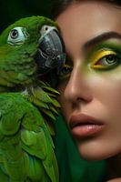 De foto toont een fascinerende symbiose van mens en natuur. De intense groene tinten van de gevederde vriend harmoniëren perfect met de bloeiende oogmake-up, terwijl de stralende geeltinten voor een levendig accent zorgen. De zachte gelaatstrekken van de vrouw en de expressieve blik van de papegaai trekken onmiddellijk de aandacht en creëren een magische sfeer.