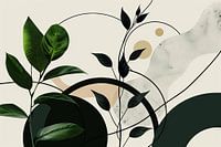 Deze compositie combineert de levendigheid van groene bladeren met geometrische vormen en lijnen. De zachte beige en bruine tinten op de achtergrond creëren een rustgevende sfeer, terwijl de fijne zwarte contouren en cirkels het werk een moderne elegantie geven. Perfect voor natuurliefhebbers die een vleugje hedendaagse kunst aan hun huis willen toevoegen. Dit stuk brengt rust en stijl in elke kamer.