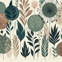 Dit naadloze patroon heeft een gestileerde verzameling botanische elementen in een gedempt palet van crème, verschillende tinten groen en zachte bruintinten. Het ontwerp toont een verscheidenheid aan bladvormen, takken en abstracte bloemvormen, waardoor een natuurlijke en rustgevende esthetiek ontstaat. Het arrangement is dicht en…