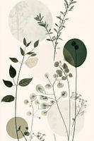 Gestileerde planten en organische vormen ontvouwen zich in zachte groentinten en creëren een harmonieuze band met de natuur. De delicate bladeren en cirkels roepen een gevoel van rust en frisheid op, perfect voor een uitnodigende keuken of gezellige woonkamer, waar ze een vleugje elegantie toevoegen aan luchtige gesprekken en ontspannen uurtjes.