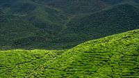 Deze close-up van de theeplantages in de Cameron Highlands toont de verfijnde patronen die door de theestruiken gevormd worden. De glooiende heuvels lijken een tapijt van groen, zorgvuldig aangelegd door menselijke handen maar harmonieus opgenomen in het landschap. Het spel van licht en schaduw accentueert de textuur en geeft de heuvels een bijna abstract karakter. Dit beeld benadrukt hoe cultuur en natuur samen een uniek landschap kunnen creëren. Het resultaat is een visueel rustgevend tafereel dat zowel kracht als verfijning uitstraalt. Een werk dat perfect past bij een interieur dat vraagt om diepte en subtiele schoonheid.