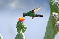 groene kolibrie ( blue-tailed emerald) zuigt nectar uit een bloeiende cactus