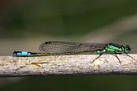 Macrofoto van een groene lantaarn libelle op een rietstengel