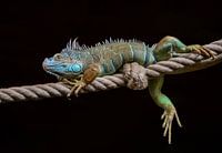 Kijk naar de schitterende kleuren van deze groene leguaan. Hij ligt rustig op een touw en houd zo alles in de gaten.