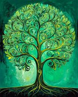 Dit is een digitaal kunstwerk van een levensboom met een mooie groene achtergrond. Een spiritueel en rustgevend beeld geschikt voor bijvoorbeeld een yoga- of meditatie ruimte.