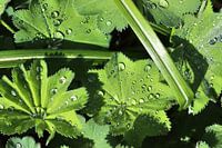 Groene planten en bladeren met verse regendruppels erop