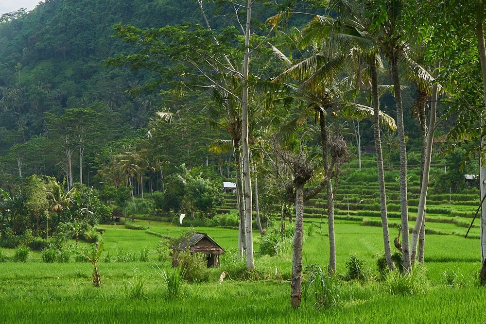 Groene rijstvelden in het Oosten van Bali, Indonesië.