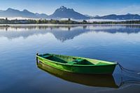 Groene roeiboot bij zonsopgang in Hopfensee, Allgäu, Beieren, Duitsland