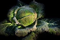 Groene savooiekool op het veld. De achtergrond is donker. De savooiekool is licht bedekt met vorst.