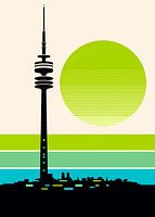 Een gedurfde, moderne weergave van een stad gedomineerd door een hoge communicatietoren. Abstracte groene strepen en een grote zon vullen de achtergrond en zetten een futuristische toon tegen silhouetten van daken.