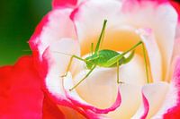 Groene sprinkhaan op rood-witte roos. Deze foto heb ik gemaakt in mijn eigen achtertuin. Op dat moment bloeide deze prachtige tweekleurige roos in mijn tuin. Het groene insect kleurt mooi bij de kleurrijke bloem.