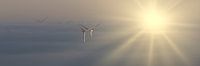Stroomopwekking door middel van windenergie met windturbines. Landschap met opkomende zon.