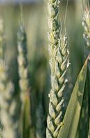 Oren van groene tarwe die nog onrijp is. Deels kleine bloesems hangen aan de aar. De zon schijnt van boven