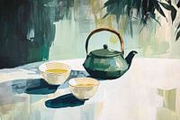 Deze serene afbeelding toont een traditionele groene theeset met twee beige kopjes op een minimalistische achtergrond. De zachte kleuren en subtiele schaduwen creëren een rustgevend geheel, perfect passend in een modern interieur. De bladeren op de achtergrond versterken de natuurlijke sfeer, waardoor deze afbeelding een ideale decoratie is voor keukens, eetkamers of woonkamers waar eenvoud en balans gewenst zijn. Dit design ademt een combinatie van Japandi en minimalistische stijl, wat het perfect maakt voor liefhebbers van een strakke en toch warme uitstraling. Een subtiele eyecatcher met een tijdloze elegantie.