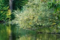 Kust van een klein meer, een grote struik met lichtgroen gebladerte torent ver boven het wateroppervlak uit, weerspiegeling van de omgeving in het water, veel gedifferentieerde groene tinten, achtergrond onscherp - locatie: Duitsland, Saksen