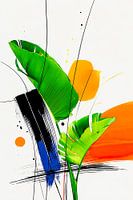 Levendige groene bladeren met zichtbare penseelstreek ribbels. Een zwarte verticale kleurentrein met een klein blauw ligt ervoor. Een zacht oranje vlak glinstert aan de rechterkant. Fijne grijze lijnen trekken bogen over de achtergrond. Kleine spetters en twee donkere stippen zetten accenten. Onderaan lopen delicate horizontale…