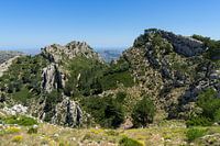 Uitzicht op het weidse berglandschap, dat vlakbij de Middellandse Zeekust ligt. Een strakblauwe lucht ontmoet grillige rotsformaties en groene hellingen. De bergkam van de Sierra del Ferrer is ruig en heeft een complexe vorm. Alleen een ongedefinieerd pad leidt over de bergkam. Wandelavonturen op een warme en zonnige…