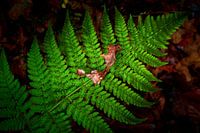 Op het het blad van een nog groene vaarn (plant) ligt een verkreukeld herfstblad. Onder het groene blad ligt een laag van herfstbladeren op de bodem.
