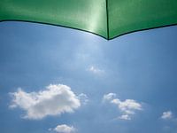 Van onderen genomen. De paraplu wordt mooi beschenen door de zon. de wolkjes erbij maakt het plaatje compleet.