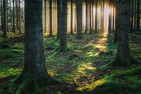 Het prachtige dennenbos in Ternell dat deel uitmaakt van het Hertogenwoud. Statige dennen waarvan de wortels volledig bedekt zijn met groen mos terwijl de opgaande zon zijn eerste zonnestralen het bos doet opwarmen.
