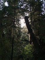 De zon schijnt door het dichte gematigde regenwoud in het Pacific Rim National Park Reserve op Vancouver Island in British Columbia, Canada met de contouren van een gebroken boomstam in de herfst.
