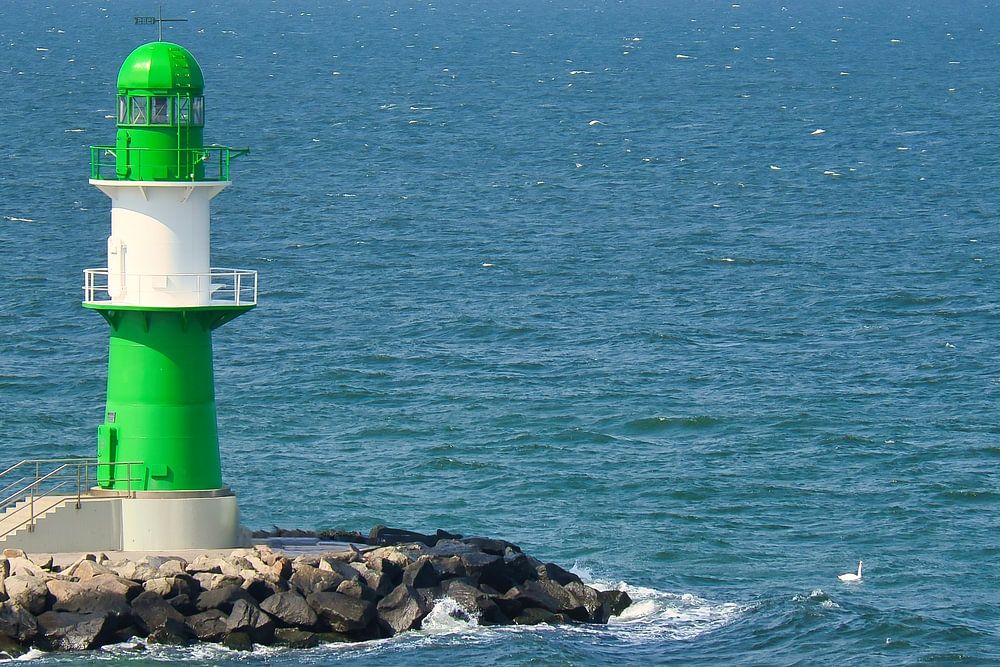 Groene, witte vuurtoren aan de Oostzee. Golven op de stenen rand. Groot signaal