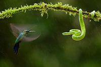 Groengele Groefkopadder kijkend naar vliegende Groenkruinbriljantkolibrie; Side-stripe Palm-pitviper looking at flying Green-crowned Brilliant