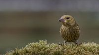 Een jonge groenling op een met mos begroeide boomstronk.