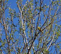 De foto toont een struik, een vogel en veel blauwe lucht.