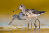 Twee Groenpootruiters (Tringa nebularia) in ondiep water.